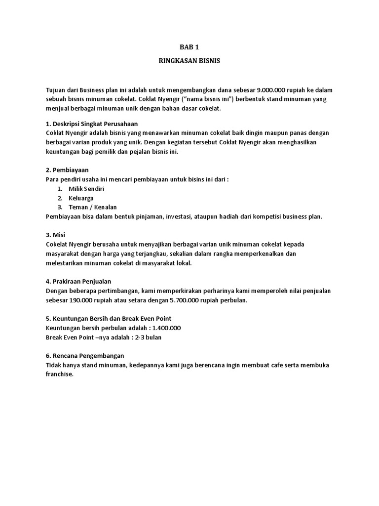 Meliputi dari awal pembangunan sampai berjalan 5 tahun ke depan. Adapun cara membuat bisnis plan Anda bisa melihat dari daftar isi di bawah ini. Segi kekurangan bisnis minuman coklat ialah minuman coklat memiliki tingkat persaingan yang tinggi dan ketat.