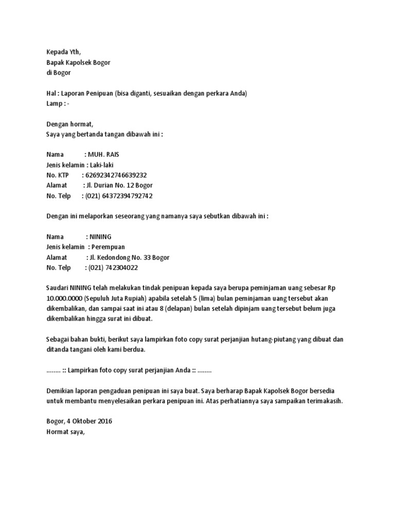 Agar dapat mengajukan laporan harus dipahami terlebih dulu cara penulisan laporan yang sesuai kaidah seperti pada contoh surat pengaduan pencemaran nama baik. Contoh surat pengaduan ke polisi cara membuatnya dan prosedur yang benar dalam kehidupan sehari hari bukan tidak mungkin kita akan mengalami tindak pidana atau menemui tindak kriminal. Contoh Surat Laporan Pengaduan Penipuan - Bapak polsek kembangan alamat.